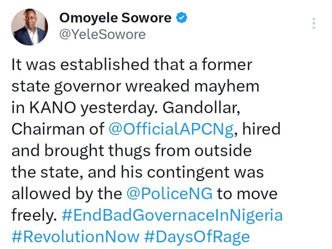 In his tweet, Sowore wrote: “It was established that a former state governor wreaked mayhem in KANO yesterday. Gandollar, Chairman of @OfficialAPCNg, hired and brought thugs from outside the state, and his contingent was allowed by the @PoliceNG to move freely. #EndBadGovernaceInNigeria #RevolutionNow #DaysOfRage.”