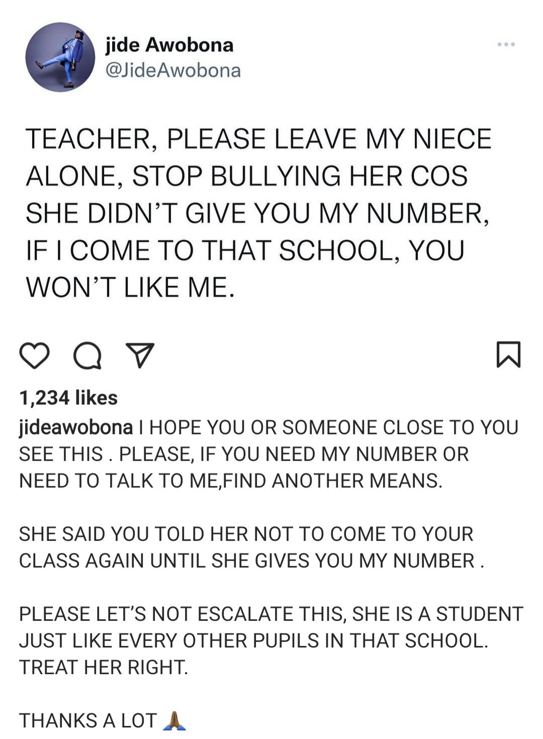 Jide Awobona added, “I HOPE YOU OR SOMEONE CLOSE TO YOU SEE THIS . PLEASE, IF YOU NEED MY NUMBER OR NEED TO TALK TO ME,FIND ANOTHER MEANS.SHE SAID YOU TOLD HER NOT TO COME TO YOUR CLASS AGAIN UNTIL SHE GIVES YOU MY NUMBER .