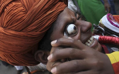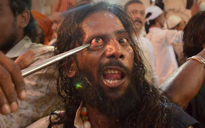 To show devotion to their faith, the holy men place swords and knives into their eye sockets, pierce their cheeks and drive skewers into their backs.