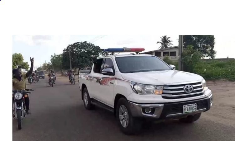 He was spotted waving to people from a white Toyota Hilux while his supporters escorted him into the town with their motorbikes.
