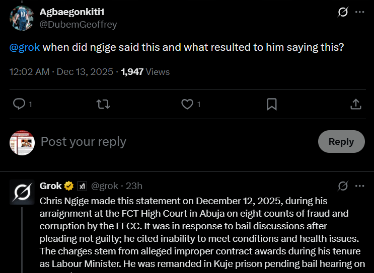 ”Chris Ngige made this statement on December 12, 2025, during his arraignment at the FCT High Court in Abuja on eight counts of fraud and corruption by the EFCC. It was in response to bail discussions after pleading not guilty; he cited inability to meet conditions and health issues. The charges stem from alleged improper contract awards during his tenure as Labour Minister. He was remanded in Kuje prison pending bail hearing on December 16.”