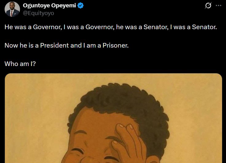 Oguntoye Opeyemi (@Equityoyo) asked his followers to guess who an ex-office holder who said he was once a Governor just like the sitting president, Bola Tinubu, and was also a Senator just like the president, but he is now in prison.