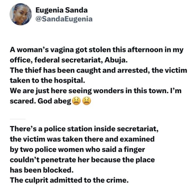 What won’t we read!!! An X user has narrated how a woman’s vag!na got stolen at her office.
