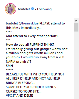 Tonto Dikeh is up and we mean very upset. So upset was she that she had to reveal it on social media. According to her a fan thinks she won’t fulfill a N20k promise, hence her regret and call out. She wrote the words you see above and further said this too;