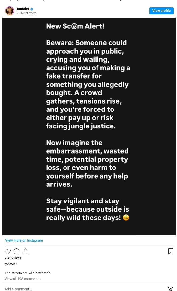 “New scam alert! Beware: Someone could approach you in public, crying and wailing, accusing you of making a fake transfer for something you allegedly bought. A crowd gathers, tensions rise, and you’re forced to either pay up or rush facing jungle justice.