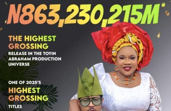 Film distributor FilmOne celebrated the achievement on Instagram, writing, “World’s Best steady delivering back-to-back Oversabi Box office numbers! Oversabi Aunty is now the Highest Grossing Film in the Toyin Abraham Production, grossing ₦850M and counting. It’s also one of the top two highest-grossing titles of 2025! Thank you to everyone who made this possible. This win is yours as well. Thank you for showing up and spreading the word.”