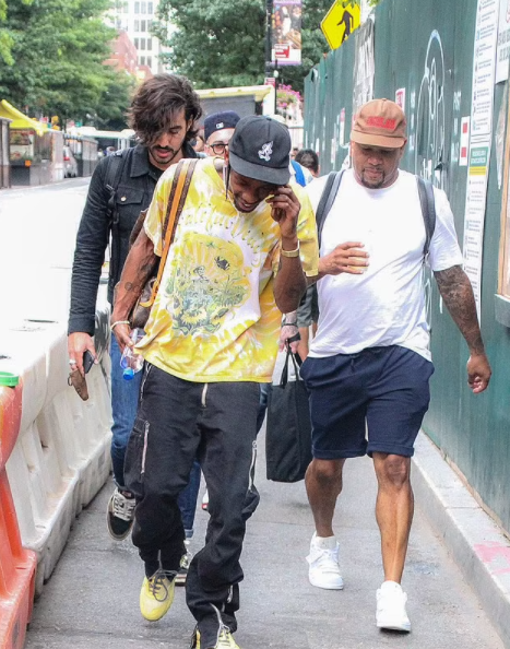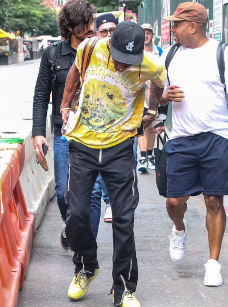 Travis looked cool and casual in black pants, a bright yellow shirt and neon sneakers with a baseball cap on while making his way around the Big Apple with an entourage.