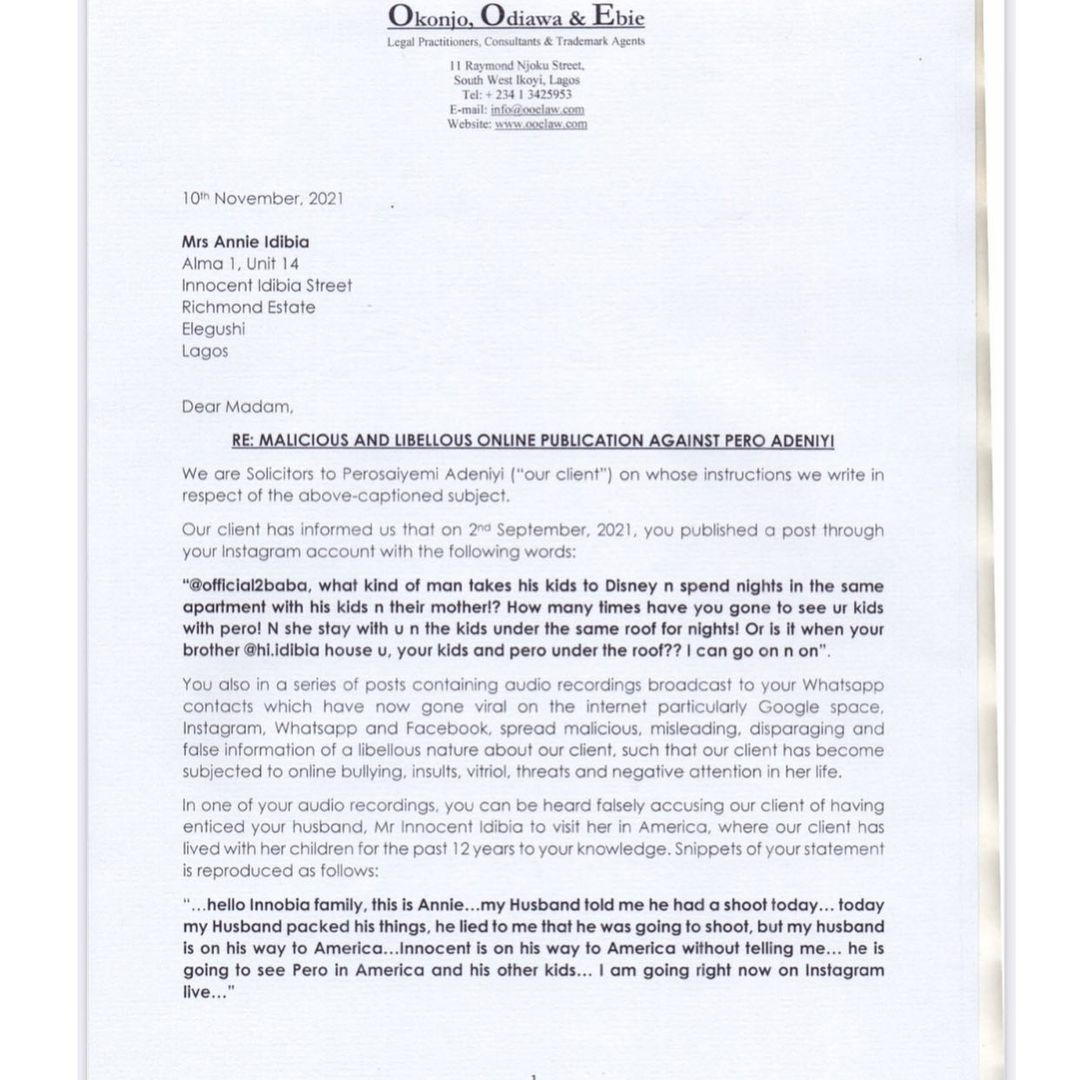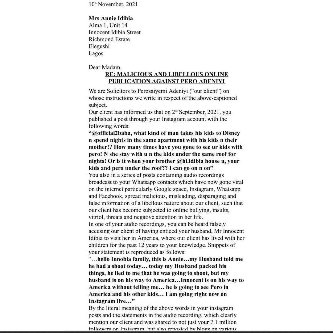 Adeniyi’s solicitors, Okonjo Odiawa & Ebi, in the petition written on her behalf, described Annie’s outburst on Instagram as malicious claims, disparaging and false information of a defamatory nature to Pero Adeniyi, which subjected her to online bullying.