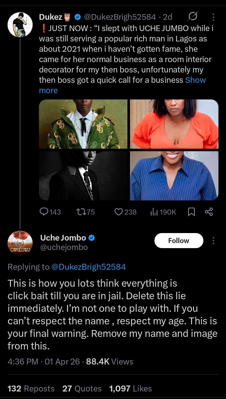 Actress Uche Jombo has threatened legal action against a social media user who falsely claimed she had a s3xual relationship with singer Bella Shmurda