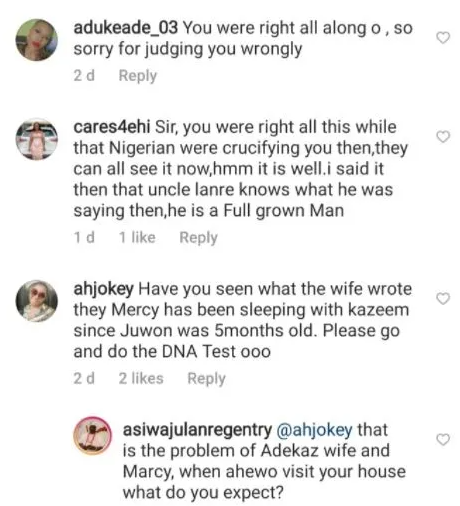 Reacting to that, fans brought Lanre Gentry’s attention to the allegations made by Asiwaju, asking whether he is privy to the allegations made against his ex-wife and they also recommended that he conduct a DNA test on his son with Mercy to be sure he is the biological father.