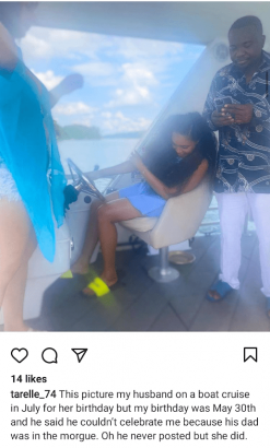 Tarelle claimed when she turned a year older in May, her husband refused to celebrate her saying his father was in the morgue.