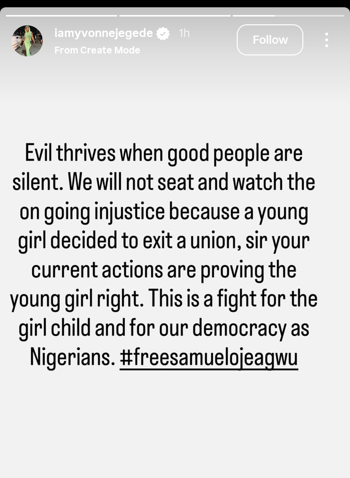“Evil thrives when good people are silent. We will not sit and watch the ongoing injustice because a young girl decided to exit a union. Sir, your current actions are proving the young girl right. This is a fight for the girl-child and for our democracy as Nigerians. #freesamuelojeagwu”